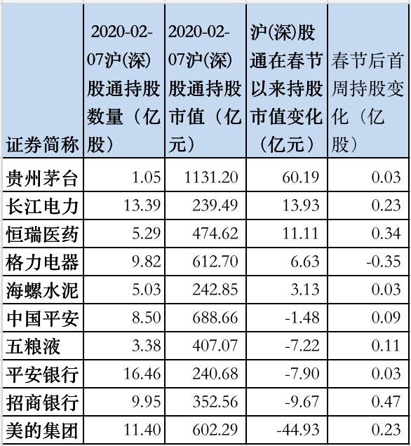 具体来看,外资10大重仓股在春节后第一周的持股市值还在增加的5只个股是:贵州茅台60.19 亿元、长江电力13.93 亿元、恒瑞医药11.11 亿元、格力电器6.63 亿元、海螺水泥3.13 亿元。