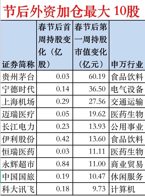 此外,外资春节后加仓市值规模前10名的还有:迈瑞医疗19.62 亿元、长江电力13.93 亿元、伊利股份13.60 亿元、恒瑞医药11.11 亿元、永辉超市11.00 亿元、中国国旅10.47 亿元、科大讯飞9.73 亿元。