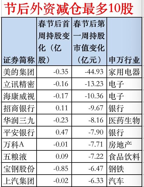 此外,春节后外资 10大减仓股还包括:招商银行-9.67亿元、华润三九 -8.16 亿元、平安银行-7.90 亿元、万科A-7.71 亿元、五粮液-7.22 亿元、宝钢股份-6.47 亿元、上汽集团-6.33 亿元。