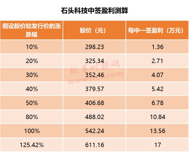 值得注意的是,石头科技是科创板新股,一签为500股,如果上市首首日上涨10%,中一签石头科技就可赚1.36万元,首日如能上涨40%,一签就可赚超过5万元,如果首日涨幅能达到80%,一签就可赚超过10万元。