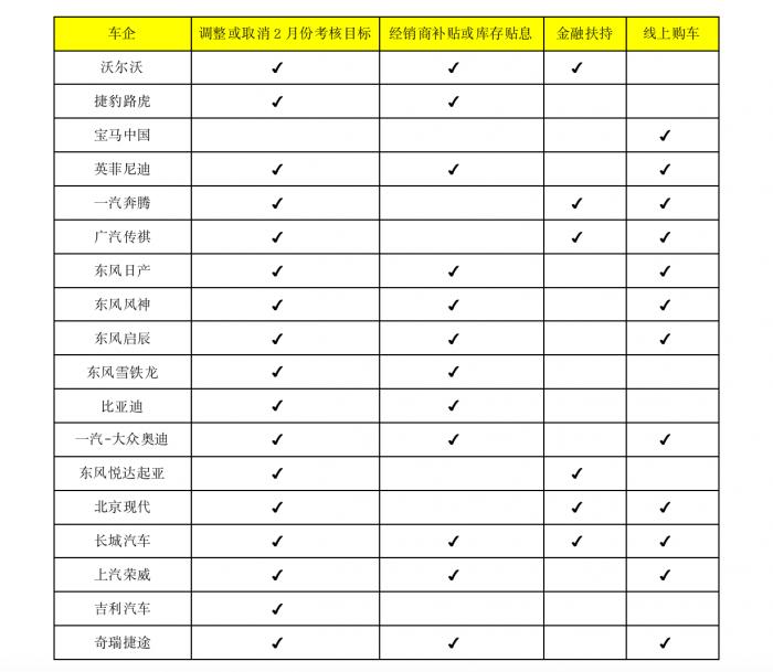 根据21世纪经济报道记者梳理,目前,沃尔沃、长城汽车、比亚迪,一汽奔腾、东风悦达起亚、东风风神、广汽丰田、奥迪、上汽荣威、大众、福特、东风启辰、广汽本田等超过20家车企已陆续出台相关扶持政策,主要举措包括:降低或取消2月或一季度销量考核、补贴经销商或库存贴息、暂停新建4S店考核、金融服务支持等。