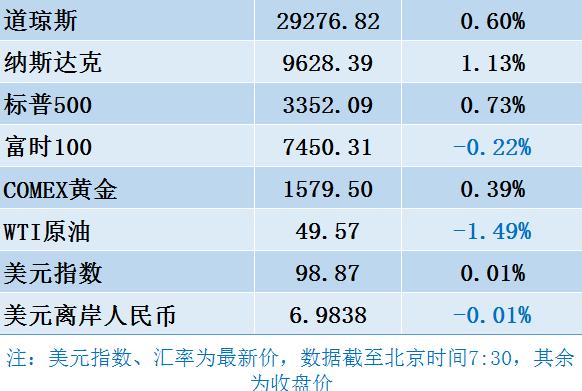 1、美股三大股指全线收涨,道指涨0.6%,涨近200点,纳指涨1.13%,标普500指数涨0.73%。美股中概教育股大涨,网易有道涨38.53%,无忧英语涨20.21%。21老虎证券-中国50指数收报1120.73点,下跌0.24%。50只成分股中,上涨17只,海螺水泥、网易、好未来、药明康德等涨幅居前。