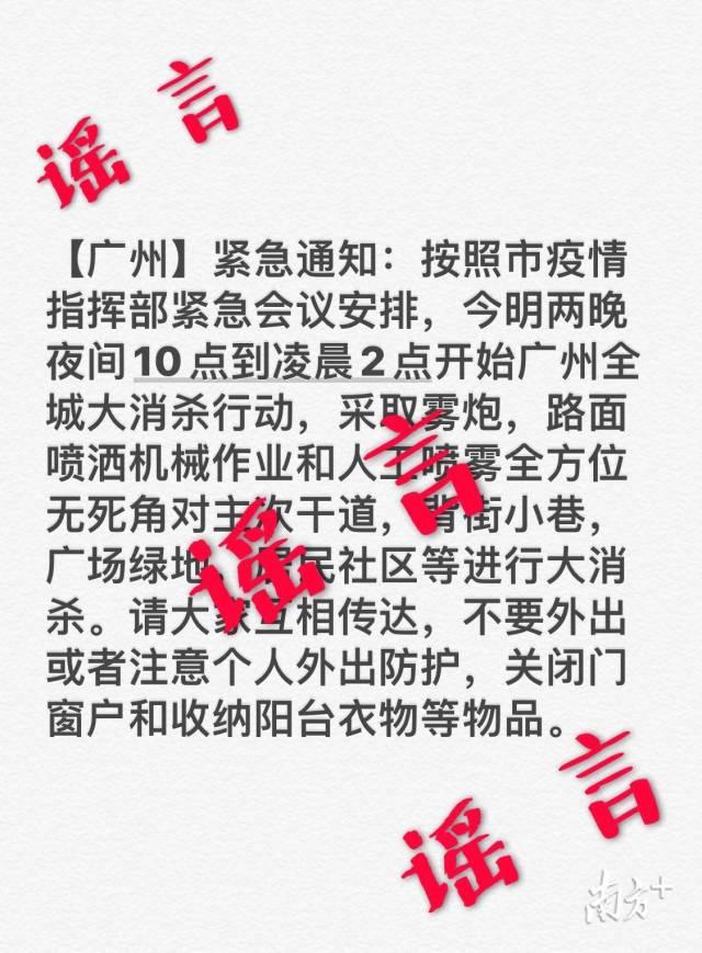 针对网传“今明两晚广州全城大消杀”的说法,记者从相关部门了解到,广州并没有这样的安排。无独有偶,青岛、攀枝花、梧州、泸州、淮北等多地也网传“全市主干道大面积消毒”的信息,但各地官方均已辟谣。
