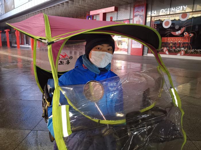 21岁的肖风雨来自内江市东兴区,来蓉从事外卖行业已经两年了,此刻,他是春熙路上为数不多的出行者。将餐点送到中山广场的客户手里后,他在路边等候着新的任务。春节前夕,肖风雨决定留在成都上班,可以获得三倍工资和平台的节日补贴。不过肖风雨说,今年许多餐厅歇业,很多社区采取了封闭措施,订单比预期的少了很多。