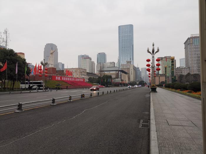 在盐市口附近,平日里拥堵的大马路,现在几乎看不见人和车,只剩下满街红彤彤的灯笼。地铁的流量仅为以往的十分之一,高峰期能挤成沙丁鱼罐头的一号线,现在人流量好似“北欧风”。