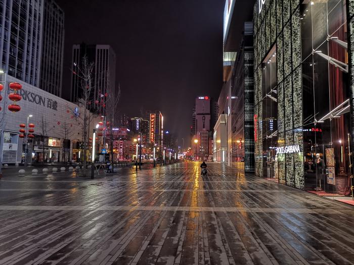 2月11日晚上八点,成都市春熙路上本应人声鼎沸,但疫情当前,市民闭门不出,商场纷纷打烊,紧邻的太古里步行街也显得有些黯淡。在非常时期,除了奋战一线的医护人员,城市中还有一个群体坚守着自己的岗位,即各大平台的外卖员。由于工作需要一直在外,使得他们成为空城中流动的“血液”。