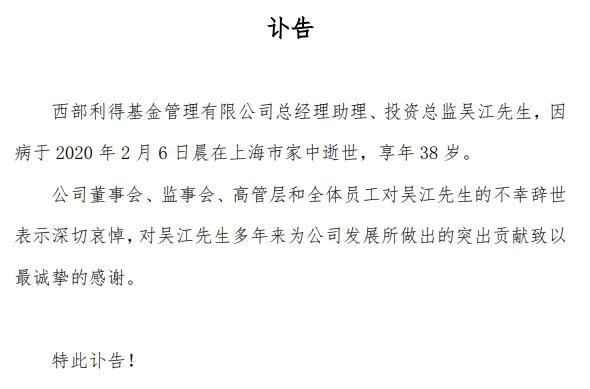 根据西部利得基金公司对内发布的讣告,公司总经理助理、投资总监吴江同志因患癌症医治无效,于2020年2月6日逝世,享年38岁。这是继1月15日,中泰证券上海虹梅路营业部原总经理李永辉被癌症夺去生命后,又一则金融人士英年早逝的悲痛消息。