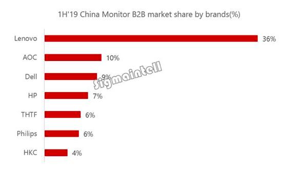 仅从中国市场显示器B2B(商用)市场来看,群智咨询(Sigmaintell)数据显示,2019年上半年,前五名分别是LENOVO(联想)、AOC(冠捷)、Dell(戴尔)、HP(惠普)、THTF(清华同方)。目前这些品牌格局较为稳定,但是去年上半年受政府、教育以及企业需求不振的影响,主力品牌的销量同比均有不同程度的下滑。