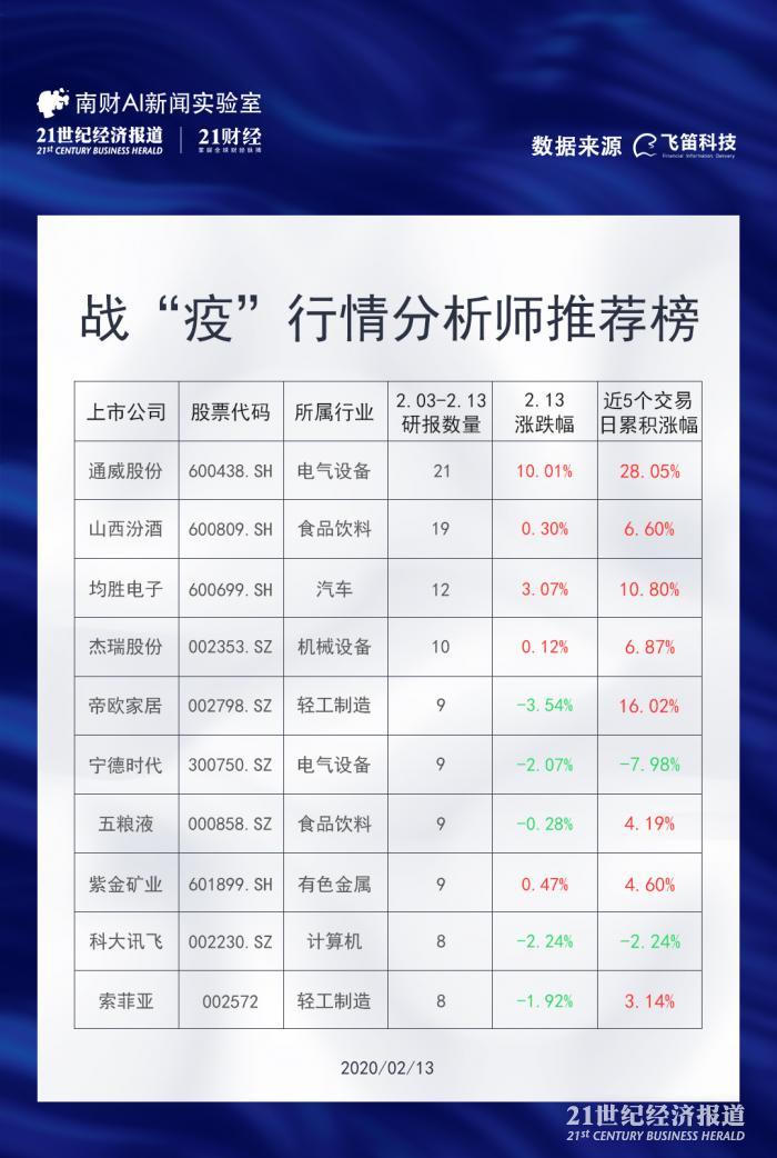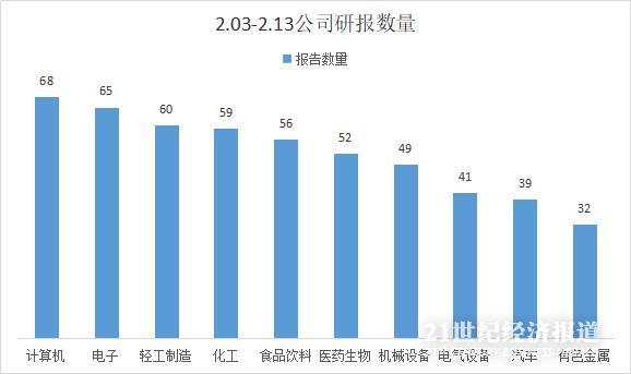在2月3日以来发布的公司研报中,通威股份、山西汾酒、均胜电子等个股发布研报数量最多。数量排名前十的公司合计发布了114份研究报告,在前十行业的研报中占比达到21%。