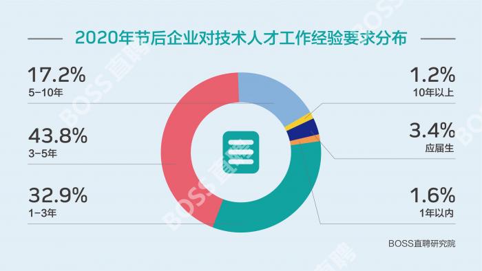 薪资的提升主要来源于招聘门槛的提高。BOSS直聘研究院发现,节后以来,互联网企业对具有三年以上工作经验技术人才的需求占比高达62.2%,同比提升7.2个百分点。明确要求本科及以上学历的岗位占比74.2%,同比提升7.1个百分点。这种趋势,也对应届生和职场新人的求职带来了更严峻的挑战。