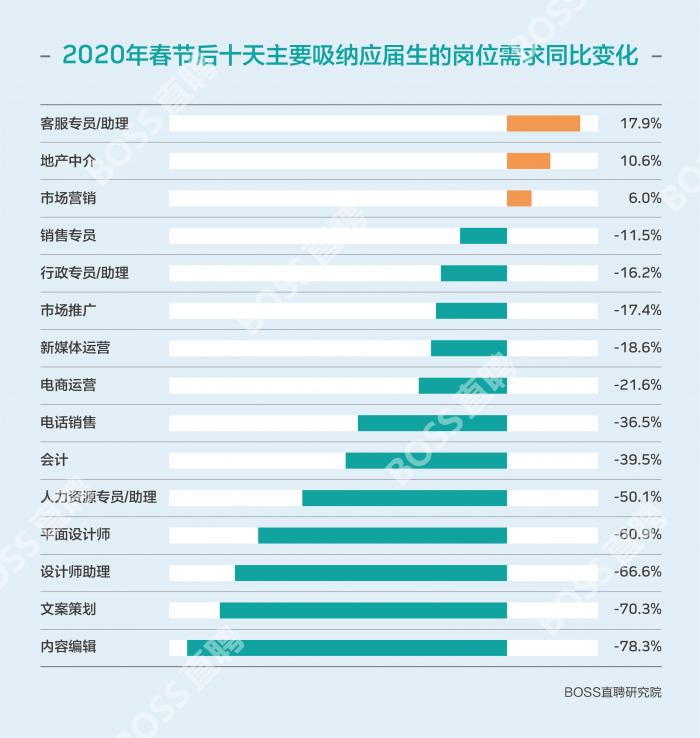 教育部高校学生司司长王辉在2月12日的新闻发布会上表示,2020年全国普通高校毕业生874万,同比增加40万人。综合考虑经济下行压力和疫情叠加的影响,预计今年上半年,高校毕业生就业面临的形势将更加复杂严峻。BOSS直聘研究院数据显示,节后十天,企业对应届生的平均招聘薪资为6202元,同比增加了12.8%,然而与学生期望的6900元仍有显著差距。同时,应届生新增岗位规模同比降幅49%,作为应届生岗位的创造主体,百人以下小微企业的应届生需求同比降幅达到60%。