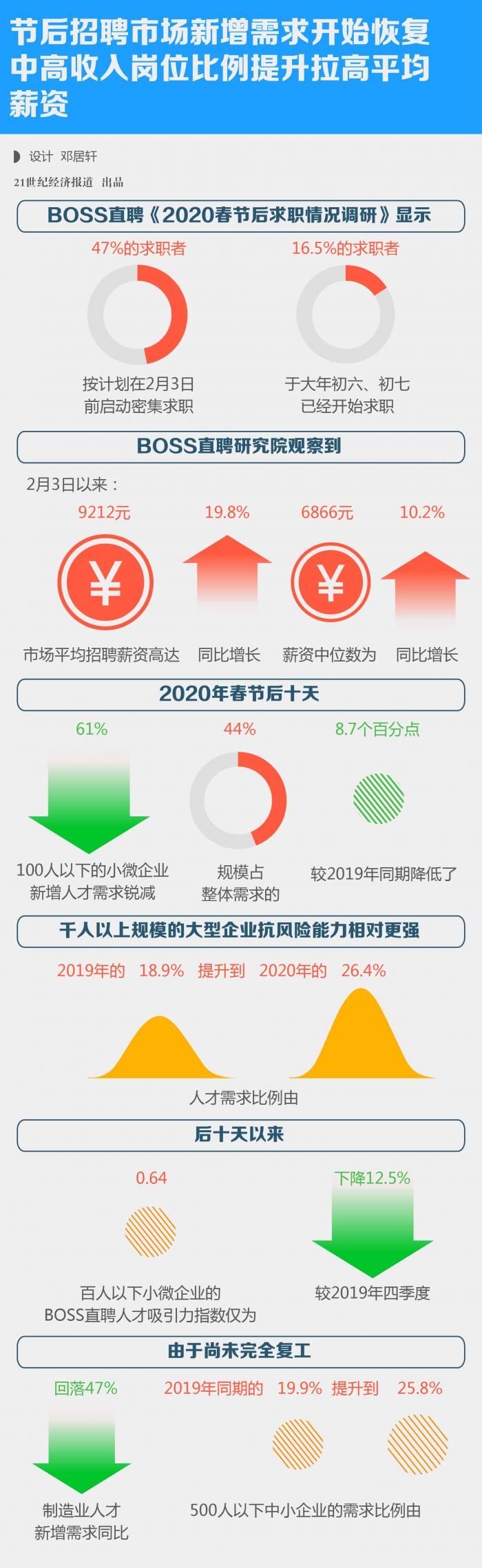BOSS直聘研究院数据显示,2020年春节后十天,100人以下的小微企业新增人才需求锐减61%,规模占整体需求的44%,较2019年同期降低了8.7个百分点;千人以上规模的大型企业抗风险能力相对更强,人才需求比例由2019年的18.9%提升到2020年的26.4%,但新增需求也尚未全部释放,同比2019年节后十天降低34.4%。