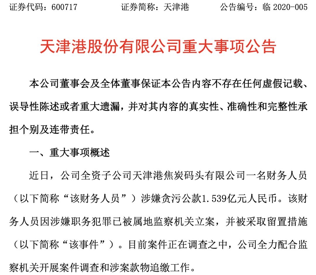 2月12日晚间,天津港(600717)对外发布重大事项报告称:全资子公司天津港焦炭码头有限公司一名财务人员涉嫌贪污公款1.539亿元,目前该财务人员因涉嫌职务犯罪已被属地监察机关立案,并被采取留置措施。目前案件正在调查之中,公司全力配合监察机关开展案件调查和涉案款物追缴工作。
