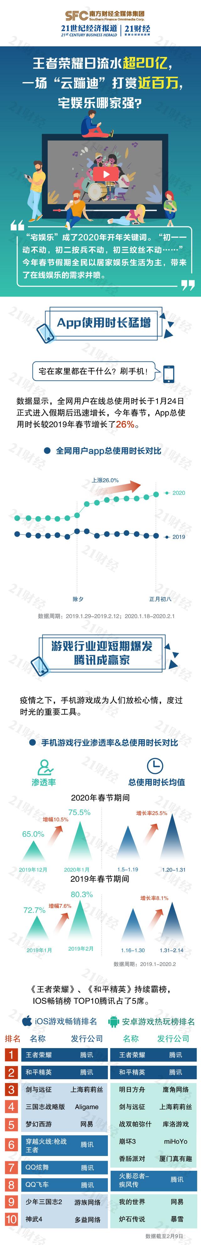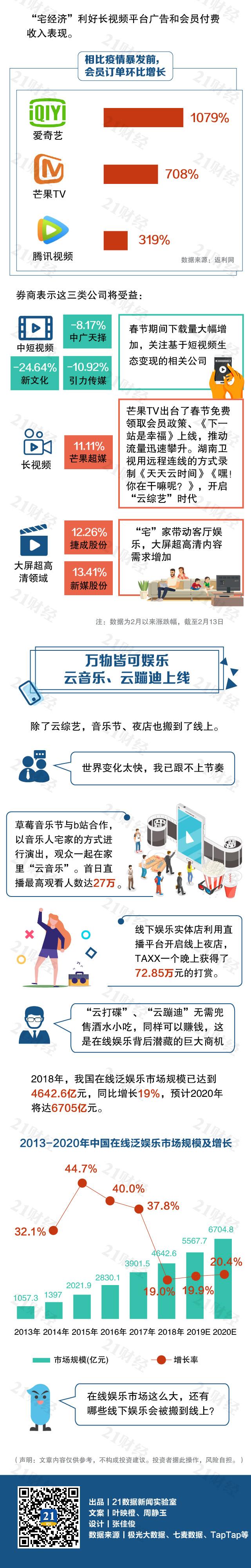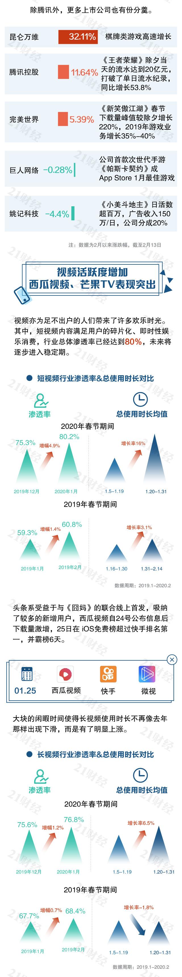 “宅娱乐”成了2020年开年关键词。游戏行业迎短期爆发,腾讯成赢家。2月以来,腾讯控股(00700.HK)涨幅11.64%。受益于棋牌游戏,昆仑万维(300418.SZ)2月以来涨幅32.11%。