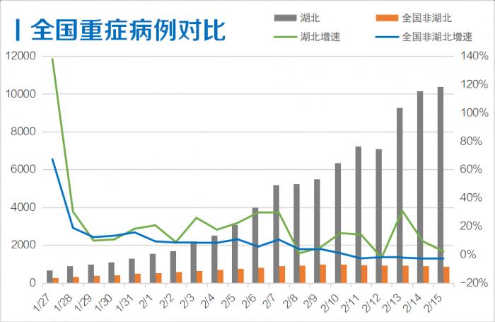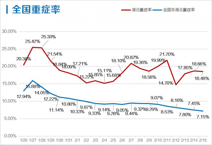 截至2月15日24时,全国累计重症病例11272例,较14日11053例上升1.98%,湖北重症病例数据也有所上升,为10396例,湖北重症率近两日维持在18%以上,较同期全国非湖北数据高近11%。从重症率指标来看,湖北从14日的18.66%小幅下降到15日18.48%,全国非湖北重症率则稳步走低,15日数据为7.15%,为近期新低。