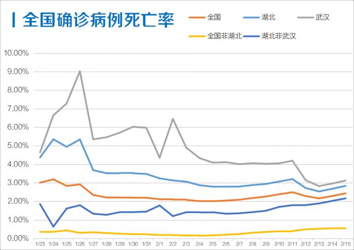 值得关注的是,确诊病例死亡率数据。全国和湖北省的病死率由于确诊基数的增大出现了两天下降,但最近两天又有所抬头,湖北外其他地区的病死率已经小幅上升8天。