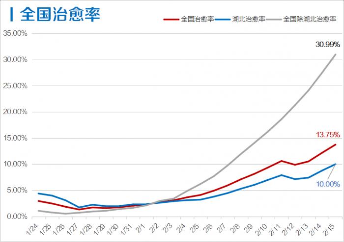 截至2月15日24时,全国新增治愈出院病例1323例,已经连续4天新增治愈出院数超过1千。过去3天,这一数据分别为:1171例(12日)、1081例(13日)、1373例(14日)。全国治愈率从最低时1月27日的1.3%上升到13.75%,其中非湖北地区30.99%,湖北治愈率首次达到10%。