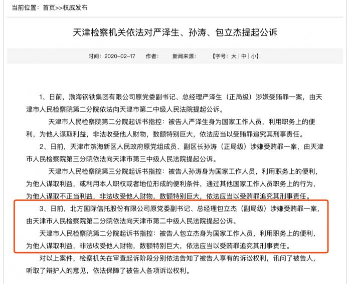 2020年2月17日,天津市人民检察院官网公布,日前,北方国际信托股份有限公司(简称“北方信托”)原党委副书记、总经理包立杰(副局级)涉嫌受贿罪一案,由天津市人民检察院第二分院依法向天津市第二中级人民法院提起公诉。