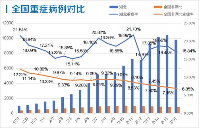 此外,截至2月16日24时,全国累计重症病例10644例,较15日11272例下降5.57%,重症率也全面回落。其中湖北重症病例数据9797例(重症8024例、危重症1773例,均在定点医疗机构接受隔离治疗),较15日下降5.76%。