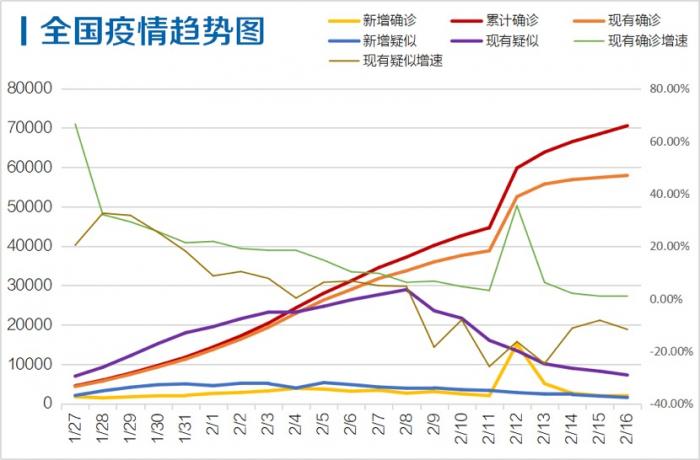 据国家卫健委关于新型冠状病毒肺炎通报的最新数据,截至2月16日24时,31个省(自治区、直辖市)和新疆生产建设兵团新增确诊病例2048例(累计70548例),现有确诊病例57934例,新增疑似病例1563例(现有7264例),重症病例减少628例(现有10644例),新增治愈出院病例1425例(累计10844例),新增死亡病例105例(累计1770例)。