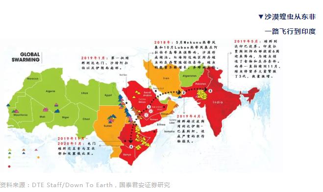 致使当日上述农产品价格大涨的关键,便在于4000亿只沙漠蝗正在印度肆虐,以及进一步东进的预期,对此各机构农产品团队也在紧急测算对农产品行业的具体影响。