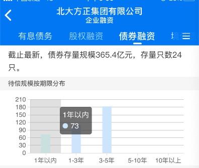 截至2月18日,北大方正债券存量规模为365.4亿,存量只数为24只,一年内到期规模为73亿。最近一期到期的债券为“19方正SCP002”,到期日为2020年2月21日(还有3天),到期规模20亿。