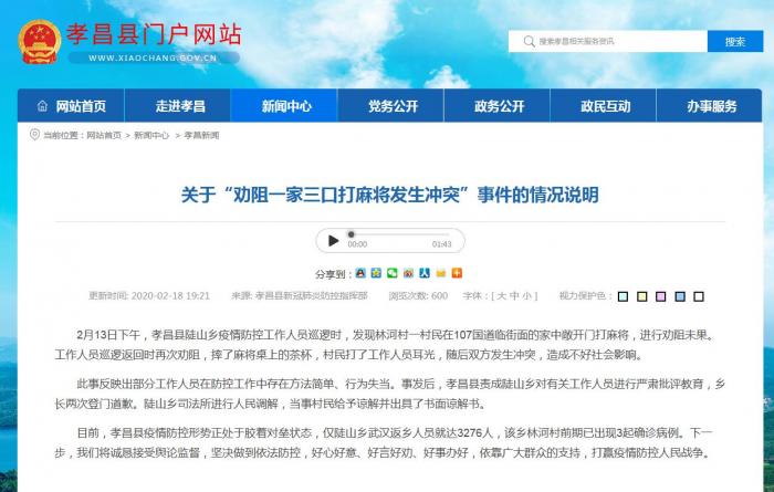 湖北孝昌回应“劝阻一家三口打麻将发生冲突”事件:乡长两次登门道歉