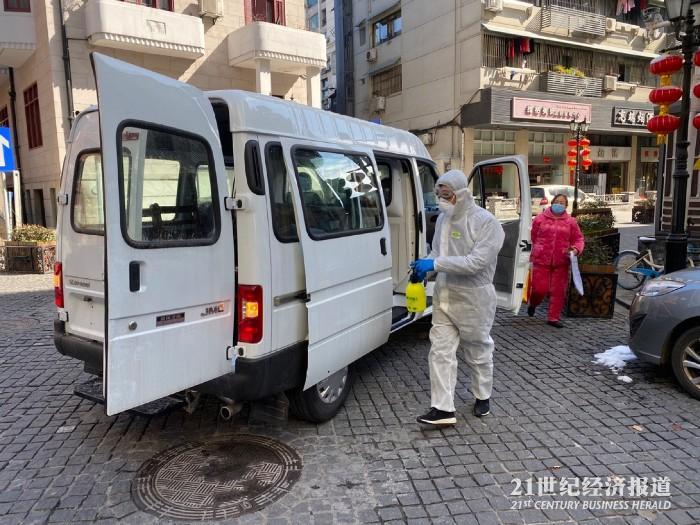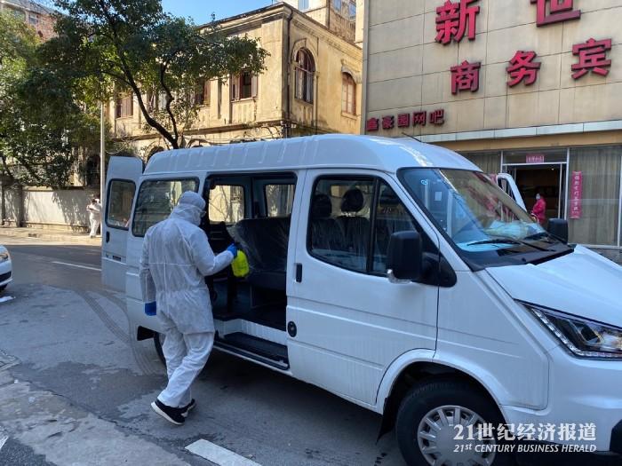 2月16日,武汉市江岸区某小区,刚送完患者到隔离点,司机第一时间为车内消毒。