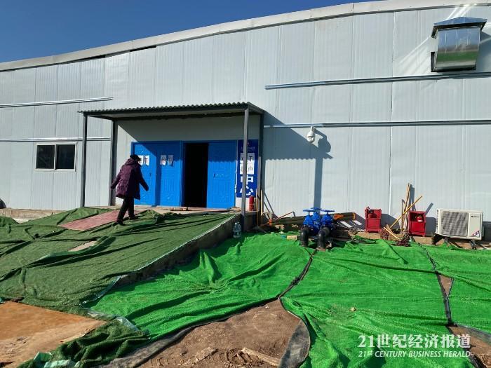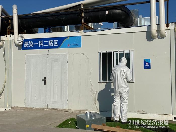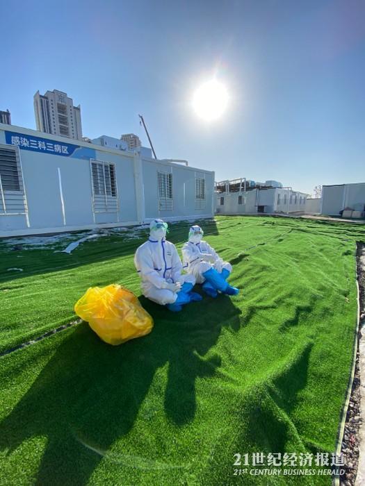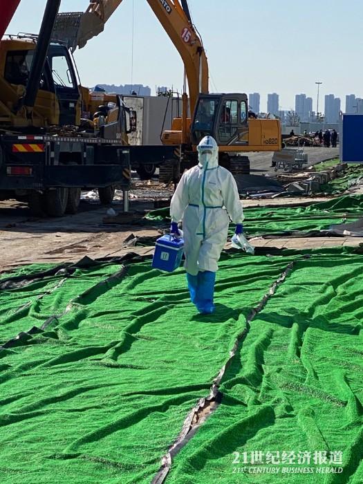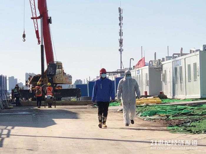 2月16日,还在建设中的雷神山医院,一名护士从病房返回。
