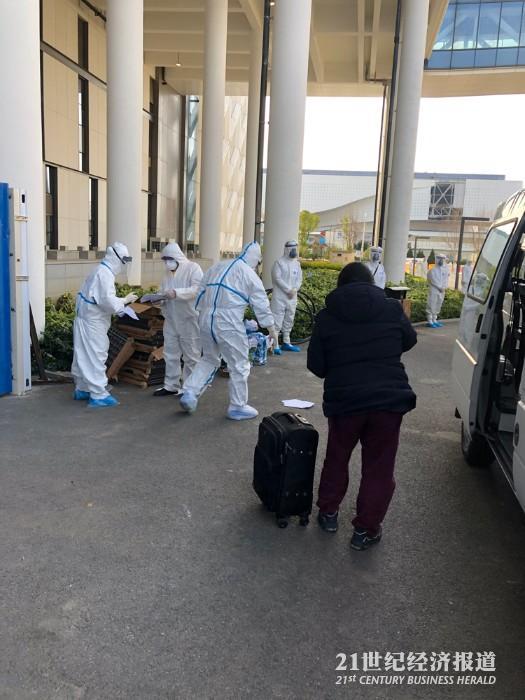 2月17日下午,光谷的武汉科技会展中心方舱医院,医护人员为患者发放电子手环办理入院手续。