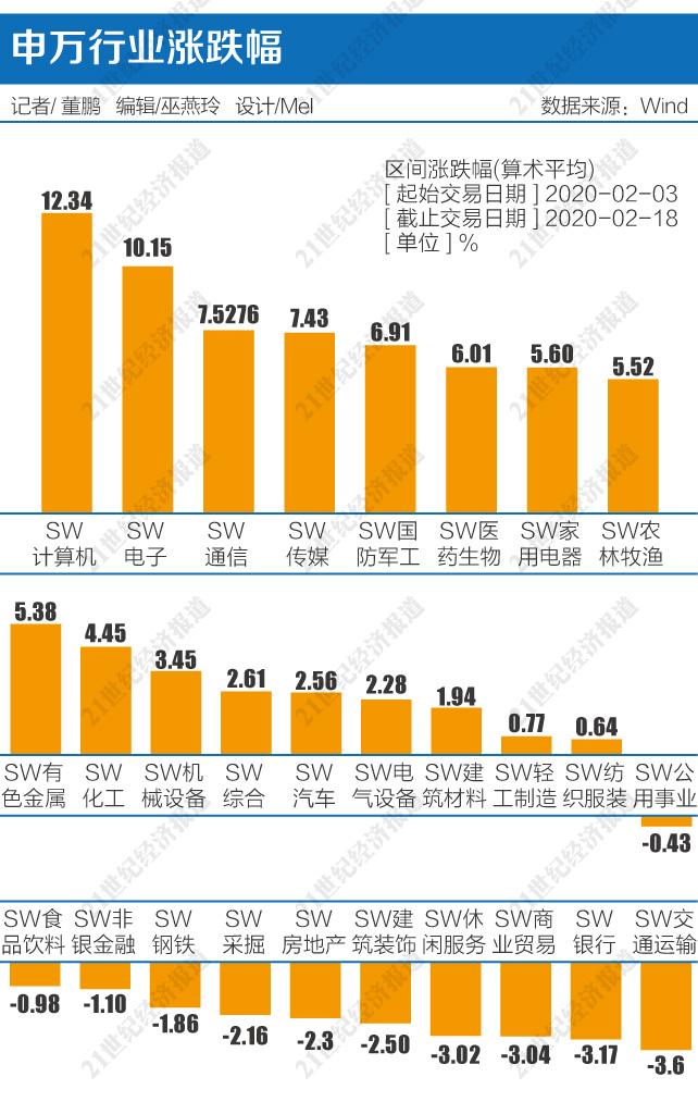 截至18日,涨幅榜排名前三的行业依次为计算机(12.34%)、电子(10.15%)、通信(7.52%)。