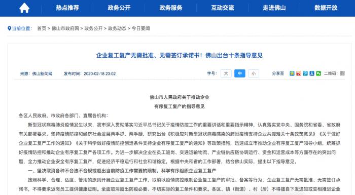 2月18日晚,佛山市人民政府出台《关于推动企业有序复工复产的指导意见》(下称“指导意见十条”),明确十项具体措施,进一步解决企业在复工复产过程中面临的员工返岗、交通运输物流、产业链供应链协调运行、资金和运营成本等突出问题。