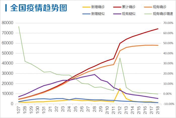 据国家卫健委关于新型冠状病毒肺炎通报的最新数据,截至2月18日24时,31个省(自治区、直辖市)和新疆生产建设兵团新增确诊病例1749例(累计74185例),现有确诊病例57805例,新增疑似病例1185例(现有5248例),新增重症病例236例(现有11977例),新增治愈出院病例1824例(累计14376例),新增死亡病例136例(累计2004例)。