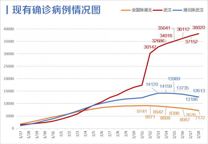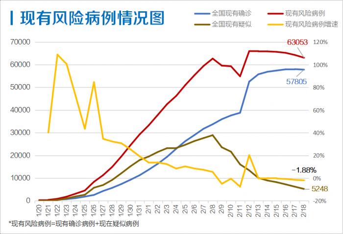 另外,截止2月18日24时,全国现有确诊病例57805例,较前一日下降211例,首次负增长!