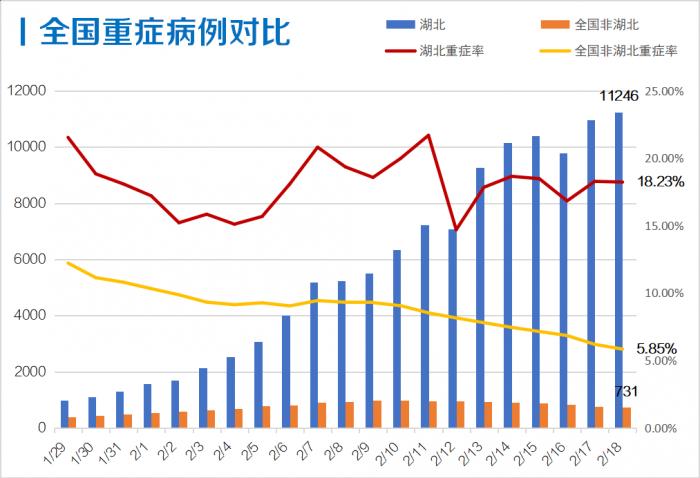 截至2月18日24时,湖北省现有重症病例11246例(武汉9562例),现有危重症病例1957例,全省重症率(含危重症)18.23%,救治压力仍然较大。