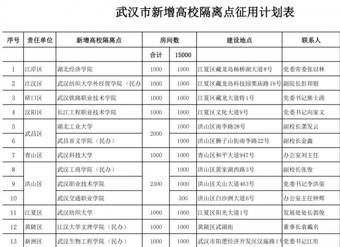 高校储备隔离点(征用高校内体育场馆等建筑用于建设方舱医院除外)主要用于发热病人和密切接触者的隔离观察,原则上不用于轻症患者治疗。16所省属高校隔离点储备计划共计15000间(详见附表),要求在2月20日前完成储备工作。隔离房间将按照一人一间一床的原则进行储备。