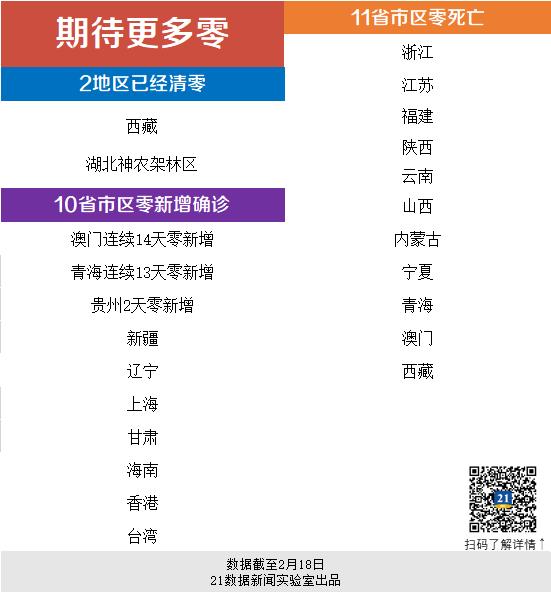 据21数据新闻实验室不完全统计,截至2月18日,全国约340个城市发现有新冠肺炎患者,其中仅有48城有新增确诊病例。返程高峰已过去近两周,像广东、浙江这些人口流动大省合计新增确诊病例仅4例,说明各地严防严控措施初现效果。