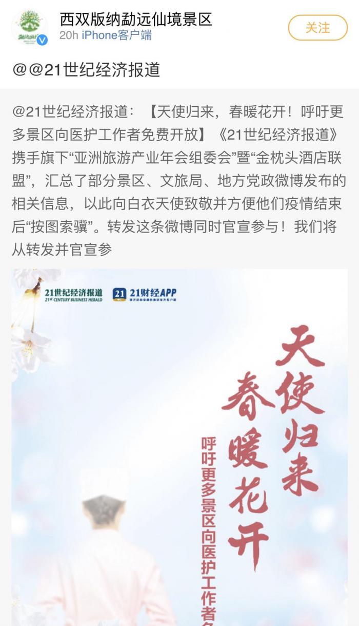 《21世纪经济报道》携手旗下“亚洲旅游产业年会组委会”暨“金枕头酒店联盟”,汇总景区、文旅局、地方党政机构官方微博/抖音发布的“景区向医护工作者免费开放”权威信息,并持续更新;致敬白衣天使并方便他们疫情结束后“按图索骥”;同时,呼吁更多机构加入这一行动。