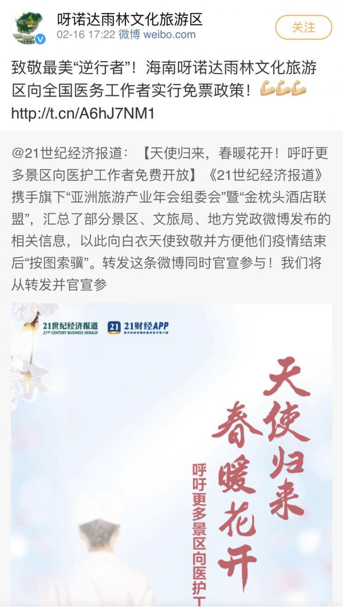 更多景区向医护工作者免费开放!今天(2.19),我们更新第四批景区、文旅局厅、地方党政机构微博/抖音官宣行动汇总!《21世纪经济报道》携手旗下“亚洲旅游产业年会组委会”暨“金枕头酒店联盟”,汇总景区、文旅局、地方党政机构官方微博/抖音发布的"景区向医护工作者免费开放"权威信息,并持续更新;致敬白衣天使并方便他们疫情结束后“按图索骥”。