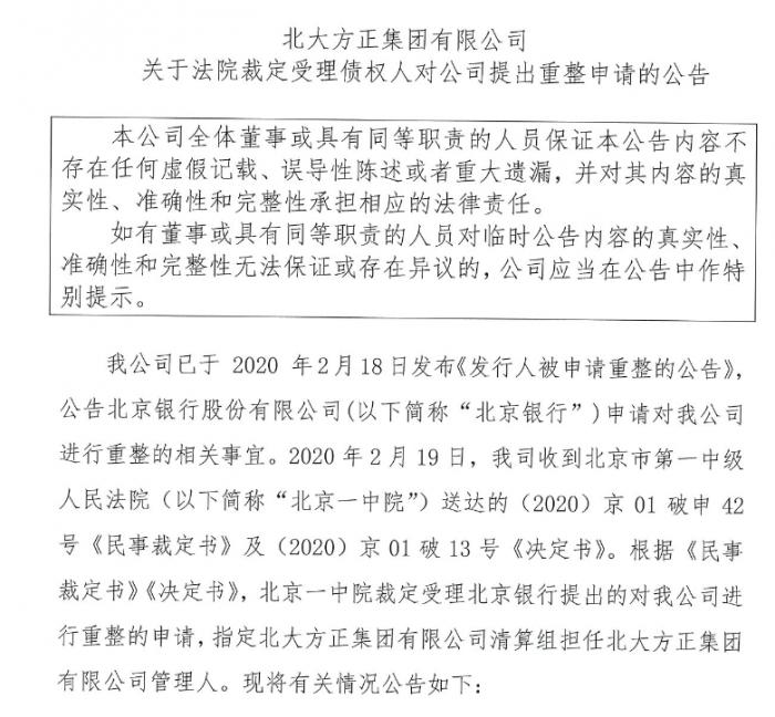 北京一中院裁定,受理北京银行提出的对方正集团进行重整的申请,指定方正集团清算组担任方正集团管理人,方正集团清算组由人民银行、教育部、相关金融监管机构和北京市有关职能部门等组成。