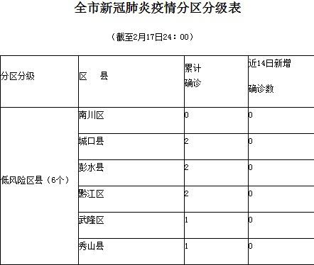 根据2月17日24时的重庆市新冠肺炎疫情的数据,重庆认定为低风险的区县为6家,分别是南川区、城口县、彭水县、黔江县、武隆区和秀山县。有26个区县被列为中风险区县。重庆主城9区,以及万州区则为高风险区县。