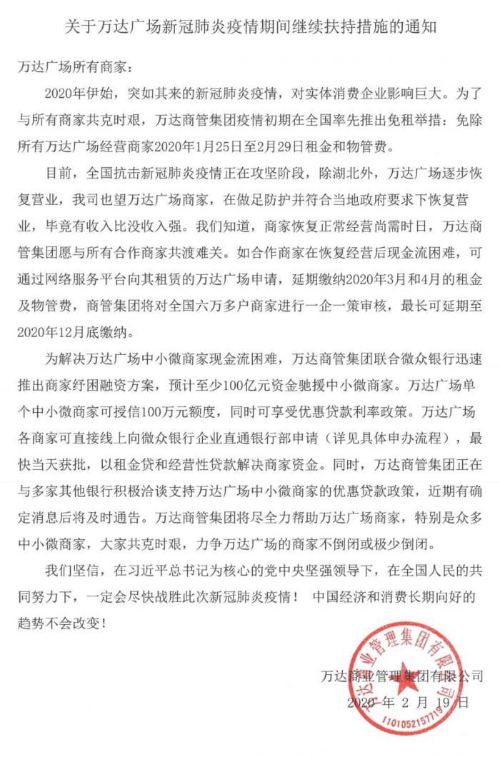 2月20日,“万达商管集团”微信公号向万达广场所有商家下发通知,为解决万达广场中小微商家现金流困难,万达商管集团联合微众银行迅速推出商家纾困融资方案,预计至少100亿元资金驰援中小微商家。万达广场单个中小微商家可授信100万元额度,同时可享受优惠贷款利率政策。