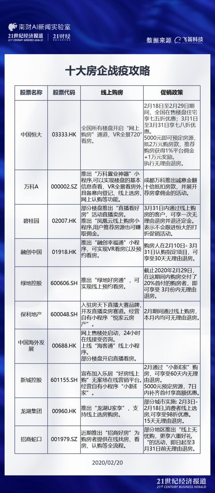 据飞笛科技统计,十大龙头房企全数推出线上售楼平台,并且大多数都给出了给力的促销政策。“无理由退房”成为了多数房企会采取的优惠政策,除万科以及中国海外发展以外,其余房企皆推行了无理由退房政策。在打折促销上,中国恒大7.5折+全民营销的优惠政策声势最为猛烈,而万科虽然反应慢半拍,但也在19日展开了诚意金10倍抵房款的促销攻势,不排除今后将有更多房企跟进。
