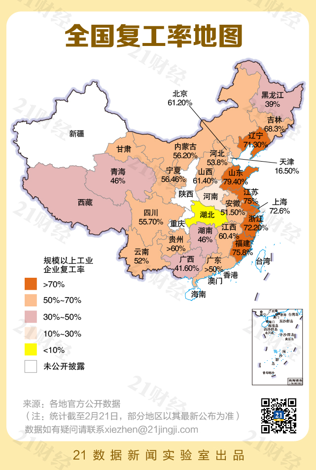 注:本文复工率数据来自各地官方最新公开数据,如有遗漏错误请联系xiezhen@21jingji.com,zhangnan@21jingji.com。