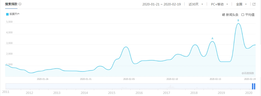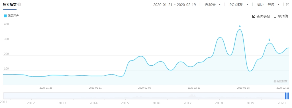 与此相印证,在单独查询武汉市“股票开户”搜索趋势时,发现自2月12日起,搜索人次便一直在高位震荡,2月14日达到最高峰,而这一天刚好落在2月12日-2月19日区间内。