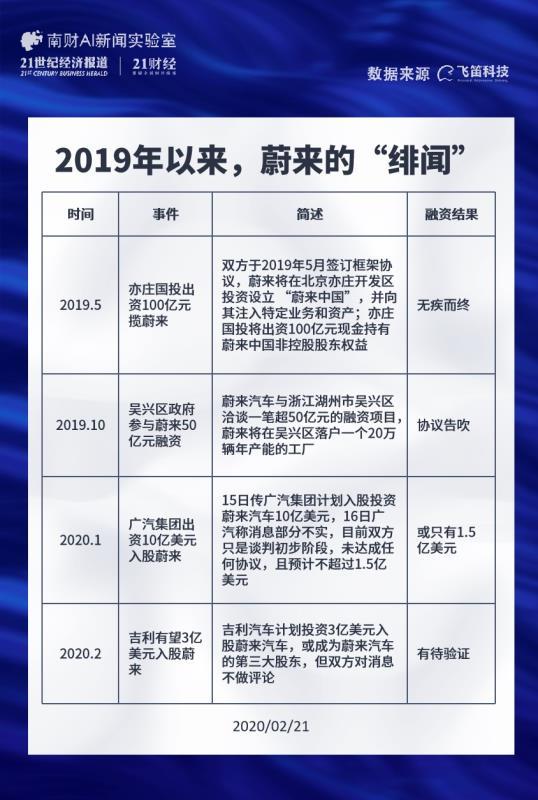 招揽地方政府投资无望,蔚来转头向传统车企寻求融资。2020年以来,蔚来相继传出广汽集团出资10亿美元入股和吉利汽车3亿美元入股的消息。但是,“绯闻”中的“白衣骑士们”似乎总是雷声大雨点小。广汽集团在10亿美元入股蔚来消息传出次日,便予以否认,并预计子公司会以部分自有资金对外募集基金的方式参与投资,金额不超过1.5亿美元,跟10亿美元资金项相比相去甚远。