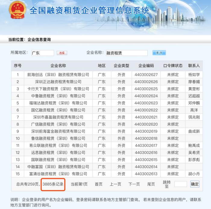 据全国融资租赁企业管理信息系统查询,截至2020年2月21日上午,广东(含深圳)所属地区融资租赁企业有3885条记录;全国总计有10857条记录。