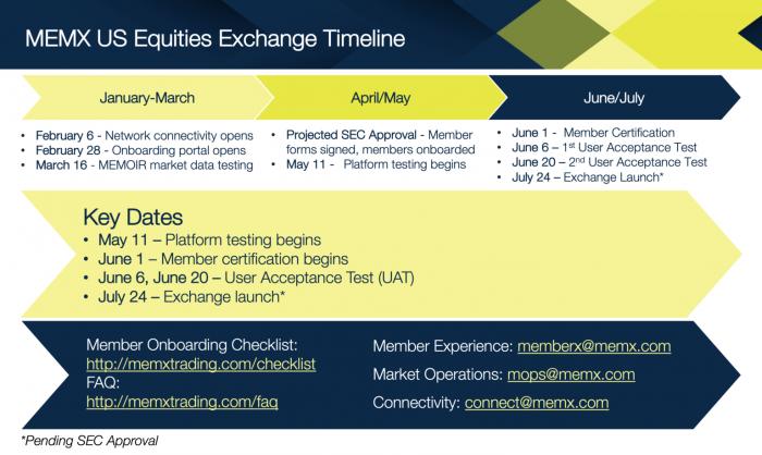 根据MEMX最新公布的时间表,该交易所预计5月11日开始全平台测试,6月开始会员认证,7月24日正式启动交易。