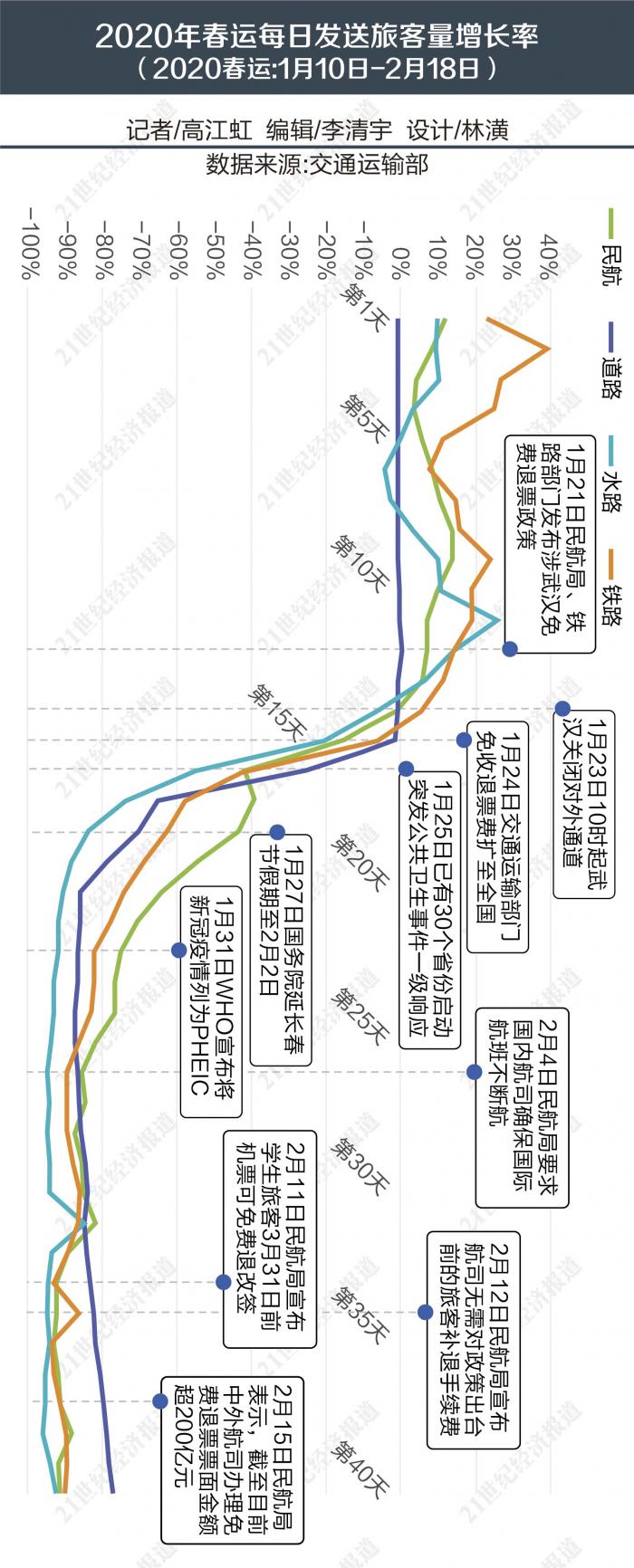受新型冠状病毒肺炎疫情的影响,自春节以来我国航空运输市场始终处于颓势,出现了负增长。中国民航局副局长李健透露,截至2月15日,中外航空公司共办理退票超过2000万张,票面金额超过200亿元。民航客流量大幅下降,从1月25日至2月14日,民航日均运输旅客47万人次,是去年同期的1/4。而从近期预测的情况看,客流的下滑势头仍然不减,2月15日至23日,日均旅客预计不超过20万人次,客流量不足高峰时期的1/10,客座率不足40%。