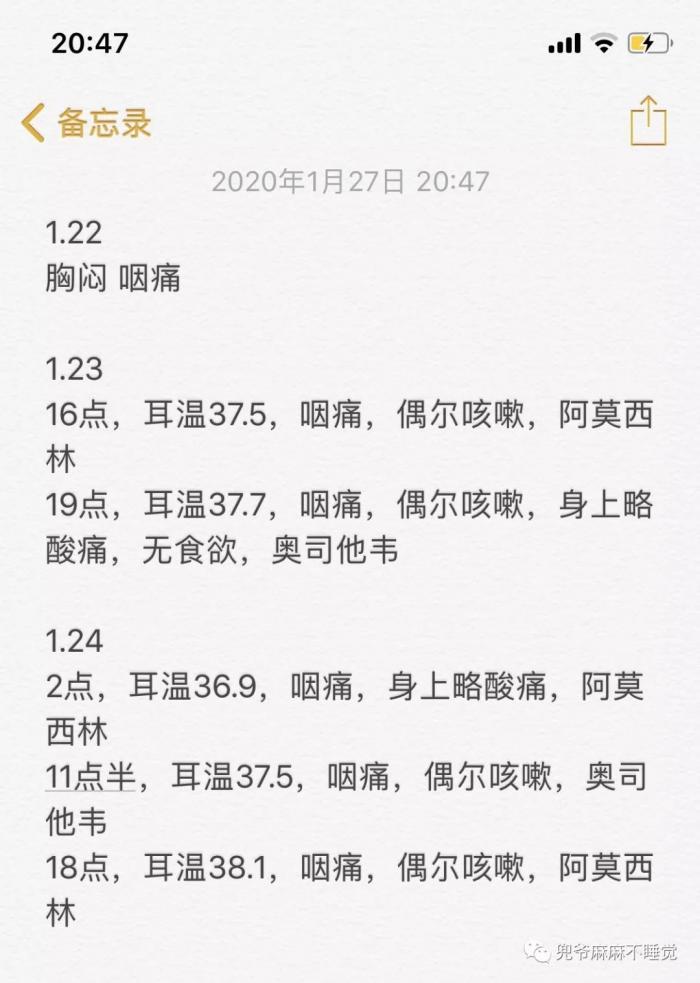 但这几天不时的在群里看到,有小伙伴说自己疑似了,就一大堆人来问什么症状,还有今天去社区医院,发现有些人的症状可能就是太紧张了而导致的,所以我决定将我这几天的病情经过写下来,包括我的症状发展和思考过程,给大家参考。